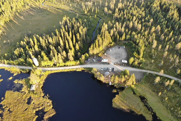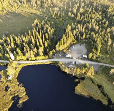 Dronefoto av Søndagsmyrdammen. God plass for mange telt, vogner og bobiler her